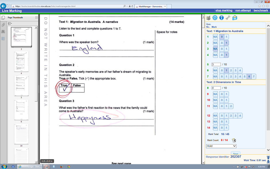 MarkManager supports both paper-based scripts and responses entered on-line by candidates and audio recordings. In a controlled on-line environment, markers access the scripts remotely over the Internet for marking.